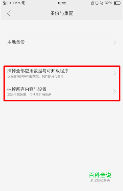 ColorOS 3.0系统:如果点击抹掉所有内容与设置,会清理所有手机数据,包括备份的数据;如果点击抹掉全部应用数据与可卸载程序,会清理软件数据,保留备份的数据。