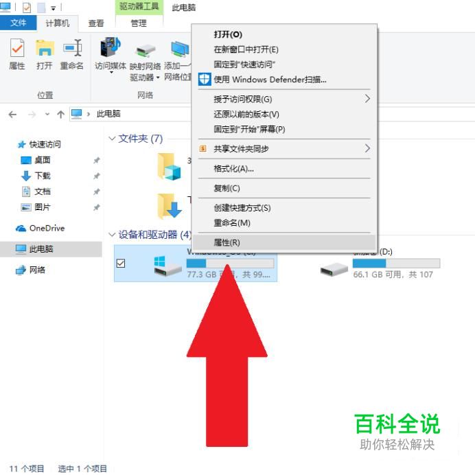 进入“文件资源管理器”窗口后,右击Win10系统安装盘,从弹出的菜单中选择“属性”。