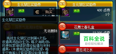 挑战DNF生化禁区模式通过赛利亚右边的NPC安德雷亚进入,每天挑战的前3次有奖励,后面需要购买商城道具才能获得奖励~