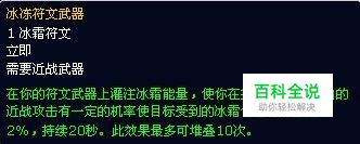 冰冻符文武器在你的符文武器上灌注冰霜能量,使你在接下来30分钟内的近战攻击有一定的机率使目标受到的冰霜伤害额外提高2%,持续20秒。此效果最多可堆迭10次。