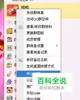 在要转让的qq群上右击。选择转让该群