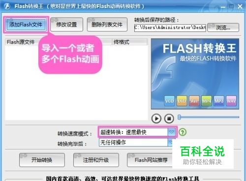 flash文件导入。 如下图所示,我们可以点击“添加flash文件”按钮将我们的flash文件导入到软件里面。我们也可以通过导入多个flash文件的方法实现批量处理,无需重复进行格式转换步骤。同时,我们也可以使用超速转换模式进行格式转换,体验一下惊人的格式转换速度!只需在如下图第二个粉色选框处选择“超速转换:速度最快”选项即可!