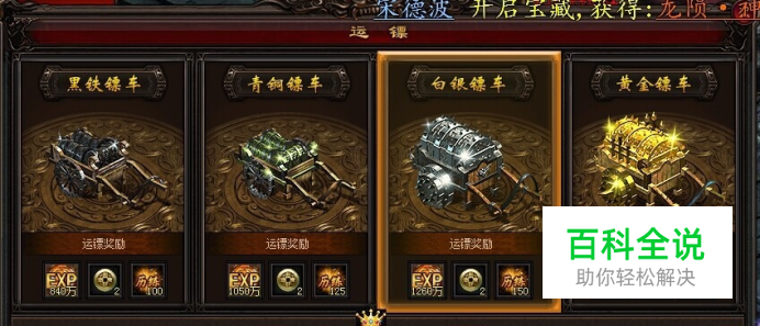 白银镖车——押镖路线经过“雷霆之城→神魔之城→兽人山寨”,送往npc【兽寨镖师】处,便能领取相应的经验值、2个招财进宝(小)、150历练积分;