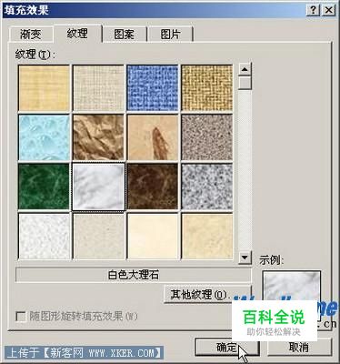 第2步,在打开的“填充效果”对话框中切换到“纹理”选项卡,在纹理列表中选择合适的纹理样式,并单击“确定”按钮即可,如图2008121902所示。 小提示:如果用户需要使用自定义的图片作为背景,可以在“填充效果”对话框中切换到“图片”选项卡,单击“选择图片”按钮选中图片,并单击“确定”按钮即可,如图2008121903所示。