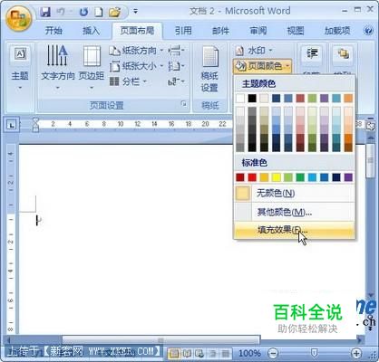 第1步,打开Word2007文档窗口,切换到“页面布局”选项卡。在“页面背景”分组中单击“页面颜色”按钮,并在打开的页面颜色面板中选择“填充效果”命令,如图2008121901所示。