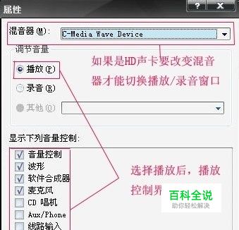 现在网络流行YY网络K歌,很多朋友不知道怎么操作,接下来就以普通的AC97声卡为例,操作系统是windows XP简体中文版。 双击电脑右下角小喇叭,会出现如下窗口。如果看不到小喇叭图标,请打开控制面板-声音和音频设备-在“将音量图标放入任务栏”上打勾。[图一] 这里看到的音量控制窗口包括了4项内容,可以调整四种音量。如何增减这里的项目呢?比如说刚装好的系统没有麦克风的音量调节选项,如果想让麦克风的音量控制出现在这个窗口,可以点选项菜单的属性,点属性后出现如下窗口: [图二] 选择“播放”,则音量控制的可选项会出现在下面的列表里,打勾的项目点确定后会出现在音量控制窗口,不打勾的项目在图一的音量控制窗口不会出现。 选择了麦克风后,点确定回到“音量控制”窗口,再点选项会发现多了一个“高级控制”选项,把它打上勾,麦克风下面会出现“高级”按钮: [图三] 点开高级按钮,可以加强麦克风音量。如果以前说话声音小,选上麦克风加强后声音立刻就变大了。 [图四] 现在再次点图一中的选项菜单,选择属性,在属性窗口里点录音: [图五] 选择“录音”,则录音控制的可选项会出现在下面的列表里,打勾的项目点确定后会出现在录音控制窗口,不打勾的项目在图一的录音控制窗口不会出现。 如果是HD声卡,“录音”是灰色的不能选择,请参照图二的说明。 这里stereo mix的意义是立体声混音,有些声卡也可能是wave out,或中文的立体声混音等等,称呼不同,但意义是一样的。 在录制窗口里,立体声混音和麦克风是必选的,其它可以不选。点确定后出现“录音控制”窗口: [图六] 需要放歌或唱卡拉OK就选择立体声混音(Stereo mix),在聊天说话拉家常的时候就选择麦克风。 如果您只是想知道如何设置,请参考下面的三幅图,按图设置就可以达到想要的效果: 一、聊天时的声卡设置: [图七] 二、只是放歌,别人听不到说话的声音时的声卡设置: [图八] 三、唱卡拉OK时的声卡设置: 现在说说设置的原理,适合所有HD声卡,AC97声卡。先说几个定义: 音量控制窗口各项目的含义: 主音量:声卡总音量 波形:音乐音量 软件合成器:软效果器插件音量 Front:前置音箱音量 Rear:后置音箱音量 Subwoofer:环绕音箱音量 Center:中置音箱音量 Side:旁置音箱音量(适用于7.1音箱) SPDIF:数字接口音量控制 Front green in:前面板绿色插孔输入 Rear blue in:后面板蓝色插孔输入 Front pink in:前面板粉色插孔输入 Rear grey in:后面板灰色插孔输入 Rear orange in:后面板橘红色插孔输入 Rear black in:后面板黑色插孔输入 Rear green in:后面板绿色插孔输入 上面这一组项目的含义是麦克风插在哪个孔,就由哪个插孔的输入项控制麦克风音量,比如麦克风插在前面板粉色插孔,则Front pink in这一项就是麦克风,同理如果插在后面板兰色插孔,则Rear blue in就是麦克风。有的声卡直接显示为麦克风。 录音控制中各项目的含义: 立体声混音:立体声混音(stereo mix)的含义是所有声音的混合,是电脑里发出的声音的混合。 CD音量:直接从CD输出声音,一般很少使用,毕竟现在谁还听CD呢。 线路音量:从输入设备输出声音的选项,比如声卡接了数字式调音台,这个选项可以直接从调音台采集声音信号。 麦克风:采集麦克风声音并输出。 出去立体声混音外,其它的选项都是采集单个设备的声音并输出。 定义说完了,现在讲原理。当录音控制窗口选择麦克风时,只有麦克风采集到的声音会被输出。所以这时只能听到说话的声音,听不见放歌的声音。当录音控制选择立体声混音时,所有电脑里的声音都进行混合,并被输出。这样就能听到放歌的声音了。 但是,当选择了立体声混音后,哪些声音会被混合,各通道的声音加入到混合音的音量如何调整呢?这时候就是由音量控制界面来调整。在音量控制界面里,选择了静音的设备将不会采集声音并混合。不同的通道采集到的声音,由音量控制的各项目调节音量。所以,这时候如果麦克风静音,就只能放歌听不到说话,而波形音量和麦克风音量的大小调整也就决定了在混合声音中二者音量的对比,比如说如果音乐声音大,就应该调低波形音量。二者混合后的总音量输出则由立体声混音的音量来控制。