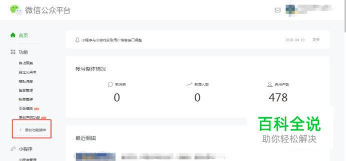 如果没有“卡券功能”选项,说明该公众号还没有开通卡券功能,接下来就要点击“添加功能插件”然后找到“卡券功能”点击开通