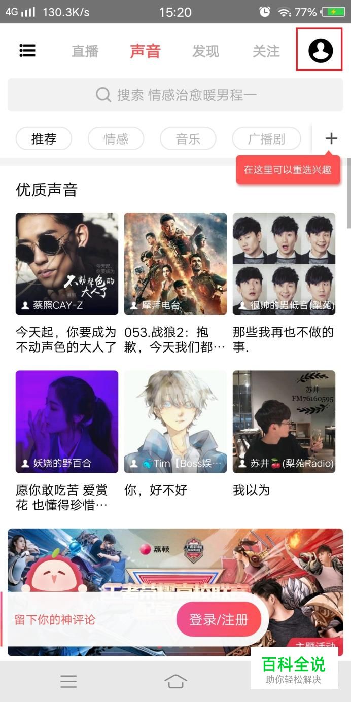 首先进入荔枝FM APP,点击右上方“我的”进行注册/登录,如图所示