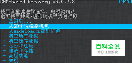 手机关机,进入刷好的recovery中 (进入的方法:手机在关机的状态下,长按手机的电源键两三秒,将要开机的时候再同时按住手机制音量增加键和音量减少键,过一会即可进入recovery了:,在recovery中音量键表示选择,电源键表示确认)