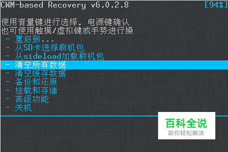 返回到recovery主界面,然后用音量键选择【清空缓存数据】,然后再选择【是的-清空所有缓存】然后按电源键确认