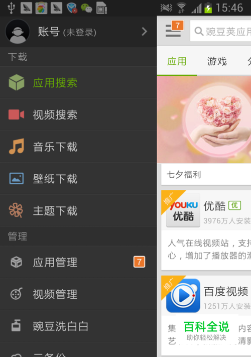 1.开启豌豆荚,侧滑出更多选项并选择豌豆洗白白;