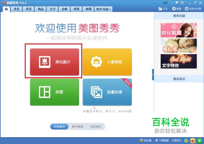 首先,打开美图秀秀,在首页点击“美化图片”。