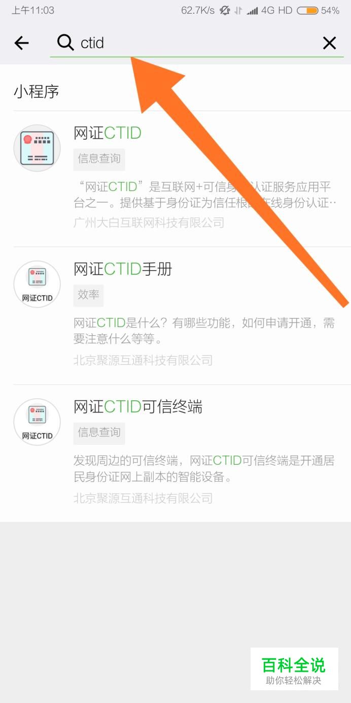 再在搜索框输入“CTID”,点击进入小程序“网证CTID”。