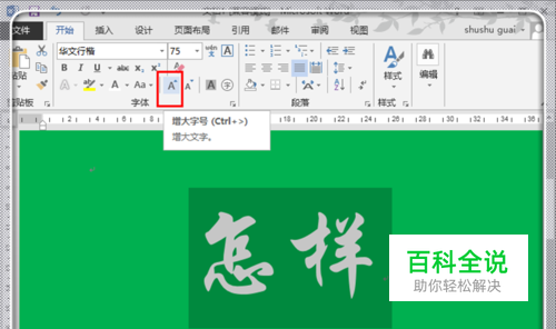 这里以word2013为例,word2013以前的版本可仿照这个方式操作。打开word2013,新建一个文档,或者是打开需要调整字体大小的文档,选中需要放大的字体,点击左上角"A"旁边有个向上的小三角形的图标即“增大字号”按钮,就可以直接实时增大字体。