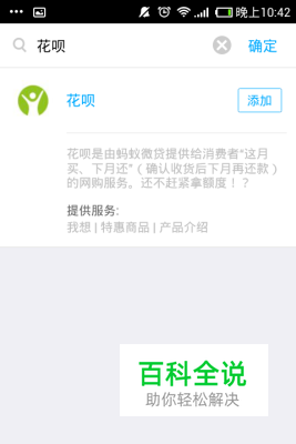 点击搜索,在搜索结果中,点击添加按钮,即可完成对花呗的关注。