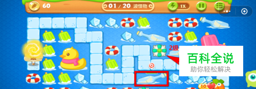 冰山清理掉以后,会出现两个章鱼塔,如果有萝卜就对章鱼塔升级,升级要注意先将1个章鱼升满级以后再去升另外一个,然后清理图示位置的小黄鸭。