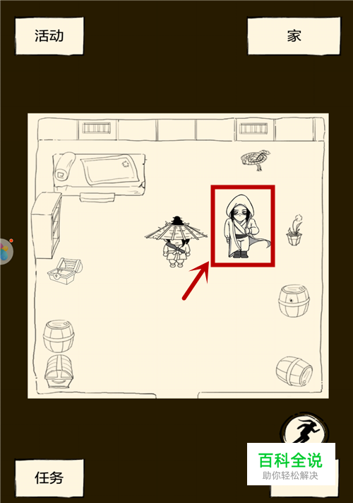 找神秘人: 如图。走出屋子,如图1位置是门,走到院中神秘人位置,点击他即可对话,之后获得一个奖励。