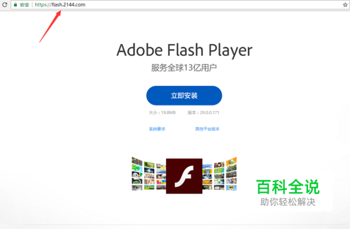 原来经提示下载的flashplayer安装版是被2144网站接管了,未翻墙时的网站就是https://flash.2144.com/(如图所示),2144网站下载的离线包就算断网安装上了也还是会被限制使用。
