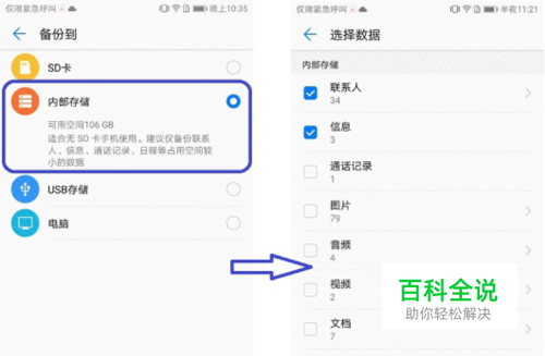 接下来选择数据备份的位置,比方说SD卡或内部存储等,然后进入下一步,选择需要备份的数据,点击“开始备份”。