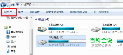 打开我的电脑,点击左上角的“组织”,选择“文件夹和搜索选项”。