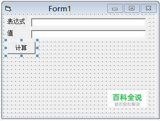 绘制界面。添加两个label控件,将caption属性分别改为"表达式"和"值"。 然后添加两个Textbox控件,将名字改为txbExpression,txbValue,分别用来输入表达式和输出表达式的值。 最后添加一个commandbutton,将名字改为cmdCalc,caption属性改为"计算"。