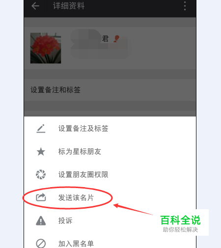 此时会弹出一个菜单。 点其中的【发送该名片】选项。