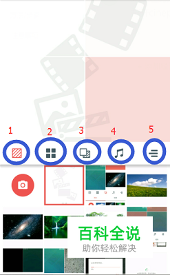 制作页面一共有5个功能按钮: 1.选取背景图片 2.选取页面格局 3.根据分割的格局选择图片或视频 4.添加背景音乐 5.分享或保存