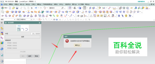 选择基本曲线中的圆角命令,这里就选择一个简单圆角,选择一条曲线,软件提示在半径内找不到两根直线。如图所示。重新将鼠标放置到需要倒角的角点,捕捉到直线,十字点在线段内侧单击,倒角成功。