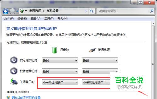 在这里,就可以设置关闭笔记本电脑盖子的后序操作,主要针对两种工作状态,那就是用电源和电池两种。