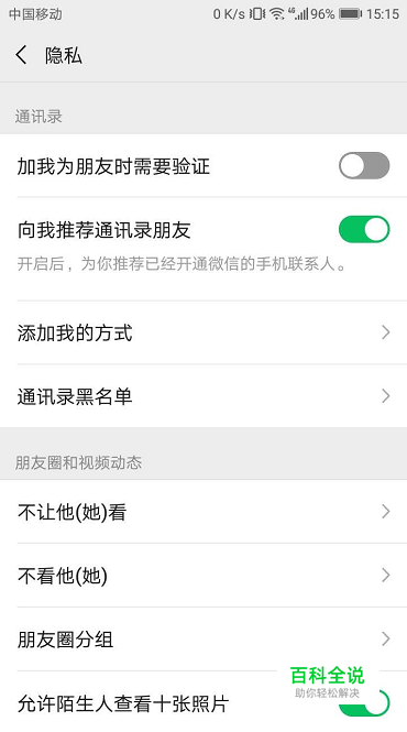 然后进入到隐私页面,可以看到 朋友圈和视频动态里有个 不让他看,如下图