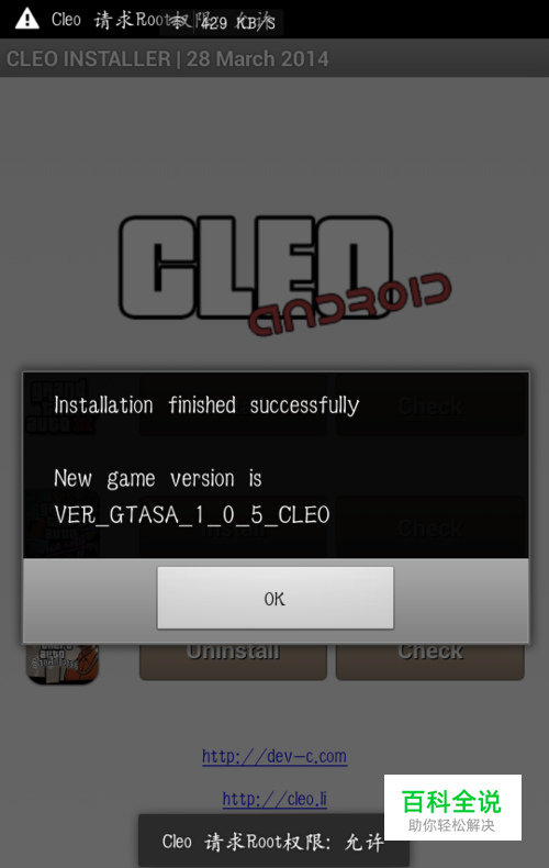 兼容性检测:安装CLEO主程序会自动检测CLEO主程序和游戏的兼容性 checking su.....true:SU最高权限检测 通过 checking chmod...true chmod 检测 通过 checking game... VER_GTASA_1_0_5_CLEO true 游戏版本 通过 installation is possible 兼容性正常,可正常运行