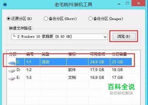 在老毛桃PE装机工具窗口中,点击浏览将win10系统添加进来,选择C盘作为系统盘,点击确定即可,如图所示