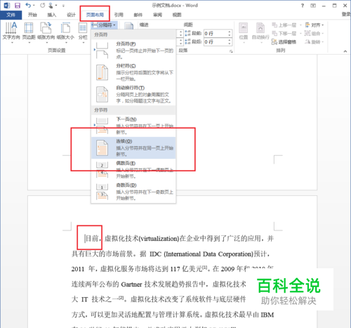 插入分节符,将首页与正文分成两个小节。操作:打开待编辑的word文档,将鼠标点到第二页的最开头,即正文的最开头,如下图所示,然后点击“页面布局”的“分隔符”,选择图中红色框圈中的“连续”。