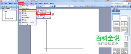 打开ppt文稿,点击“插入”,选择“图片”,再选“自选图形”,找到“箭头总汇”,选择箭头,画出箭头。(或者找到绘图工具栏,点击箭头,画出箭头。)如下图。
