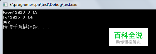 完整的程序: #include<stdio.h> #include<stdlib.h> #include<string.h> #include<math.h> #include<time.h> int get_days(const char* from, const char* to); time_t convert(int year,int month,int day); int main() { const char* from="2013-3-15"; const char* to="2015-8-14"; int days=get_days(from,to); printf("From:%s\nTo:%s\n",from,to); printf("%d\n",days); system("pause"); return 0; } time_t convert(int year,int month,int day) { tm info={0}; info.tm_year=year-1900; info.tm_mon=month-1; info.tm_mday=day; return mktime(&info); } int get_days(const char* from, const char* to) { int year,month,day; sscanf(from,"%d-%d-%d",&year,&month,&day); int fromSecond=(int)convert(year,month,day); sscanf(to,"%d-%d-%d",&year,&month,&day); int toSecond=(int)convert(year,month,day); return (toSecond-fromSecond)/24/3600; }