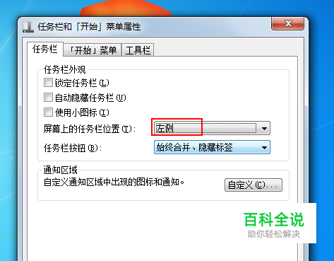 在屏幕上的任务栏位置把底部换为左侧,确定。最后看下屏幕任务栏位置在左侧的效果。