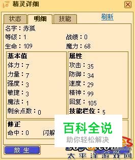 明细信息 基本值:精灵的目前点数分配,点数分为体力、力量、强度、敏捷、魔法,每次升级后将获得升级点数,玩家可以对精灵自行进行点数分配,点数越多精灵能力越强。 属性:精灵的基本值点数将会对精灵属性产生影响,属性分为攻击、防御、速度、精神、回复,属性越高精灵能力越强。 技能栏位:精灵的每个技能将占用一格栏位,技能数量越多精灵的战术越丰富。 修正:功能暂未开放