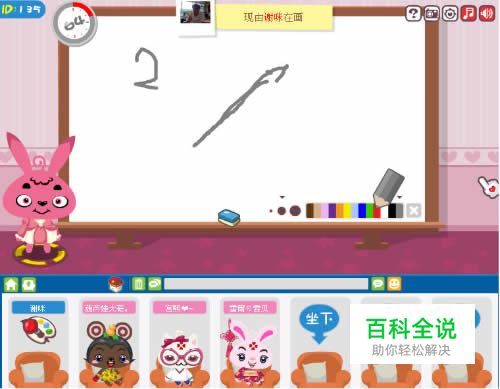 坐下之后,游戏正式开始了。 游戏分为两个过程 (1)猜词:坐下以后,就可以跟大家一起根据黑板上画的东西猜词,可能是人名,可能是地名,游戏名,漫画人物,歌名,动物等等。接下来,只需要在空白的格子里面,就是大家玩游戏发言的地方,输入你猜的答案。系统会自动选取,第一个出现的正确答案。如果你是第一个回答出正确答案的,会有加分。 (2)画画:当你看到你的宝贝从凳子上下来,走到黑板前面,你就可以自己画画了。这时黑板上会显示一个词,比如:青椒。你的鼠标同时变成了一支笔的形状,黑板的右下方有各种颜料,用笔尖点击绿色,也可以点击颜料旁边的圆点改变笔的粗细。下笔的时候,按住鼠标左键不放,就可以勾勒你想要的线条,不画的时候就放开鼠标左键。画出青椒的样子,下面的玩家就会根据你的画来猜你要画的东西,只要有玩家猜对,你就能获得加分哦!