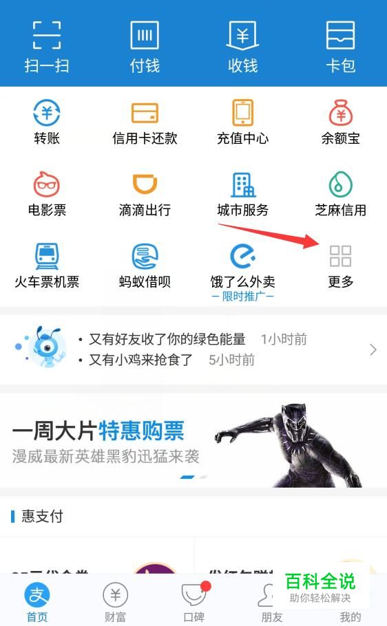 进入支付宝首页之后,单击首页面板上的“更多”按钮。