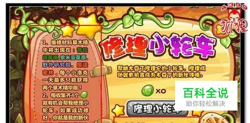 修复小轮车需要的草木精华,可以在【普拉塔草原】、【索米亚草原】、【野外研究院】和【魔法密林】里找到哦~!集齐草木精华,记得到【魔法密林】找木豆丁修复小轮车哦~!