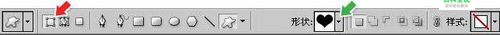 新建一个400×300的图像(可自设尺寸),然后选择自定形状工具。 注意绘图方式应为第一种(形状图层),如下图红色箭头处。然后在形状列表中选择一个心形(如不在列表中,可恢复默认形状),如下图绿色箭头处。样式选择为无样式。另外可以选取一个的颜色。