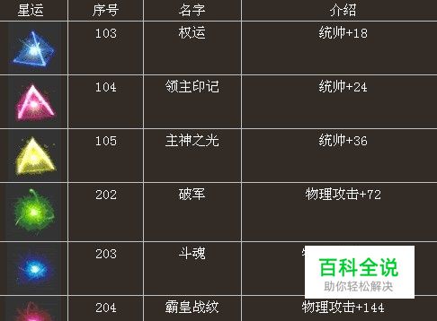 【统帅星运】 权运:统帅+18 领主印记:统帅+24 主神之光:统帅+36 【物理攻击星运】 破军:物理攻击+72 斗魂:物理攻击+108 霸皇战纹:物理攻击+144 泰坦之力:物理攻击+216