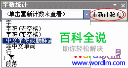 此时,会弹出“字数统计”对话框,但是框中无任何数据,我们只需要点击旁边的“重新计算”,即可算出字数、符号、行数、页数、段落等,这所有的数据。