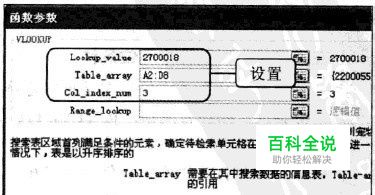 输入参数 弹出“函数参数”对话框,在VLOOKUP选项区域的Lookup_value文本框中输入已知产品批号,这里输入问题产品批号“2700018”;在Table_array文本框中输入要查找的单元格区域所对应的地址,这里输入“A2:D8”;在 Col_index_num文本框中输入生产厂商所在的列号,这里输入“3”,代表返回A2:D8单元格区域的第3列,即C列。