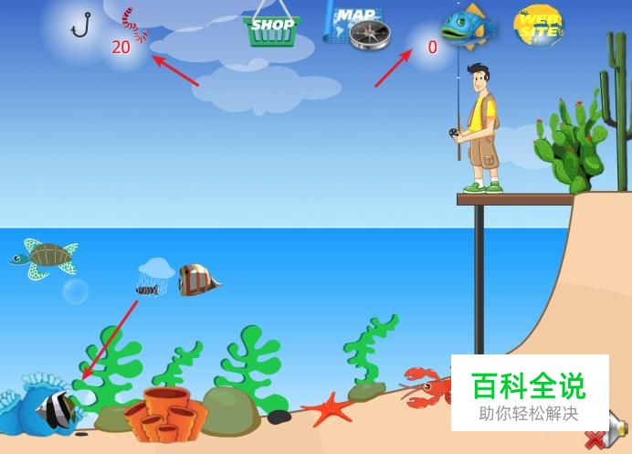 当蚯蚓数量为0时,就不能再下杆了,只能去购买,点击上方的‘SHOP’图标。