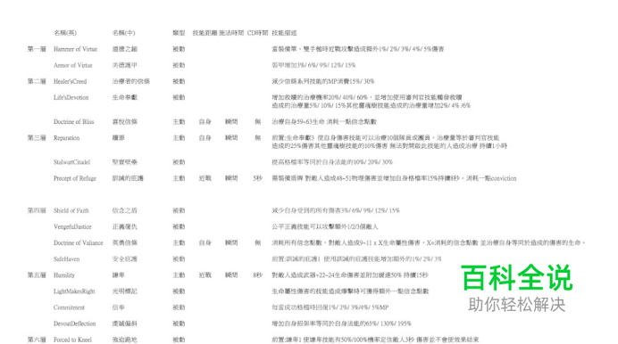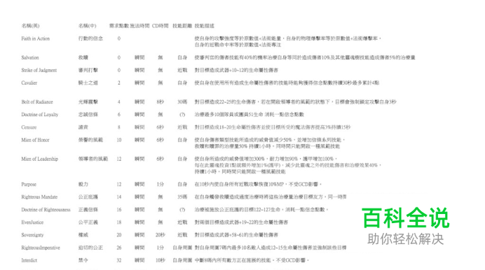 图片请另外开启观看技能是测试中的版本, 往后官方可能会有修正。距离的部分有些治疗类的技能没记错的话现在是改成35码了,所以参考看看就好了。技能的数值皆是技能等级LV1的,可向训练师提升技能等级。 施法时间有括号的为不确定的数值。Wisdom翻译为意志SpellPower翻译违法术能量简称法能Justicar和Inquisitor翻译其实有点相近但意思有点不同,前者是法庭的审判官,而后者是对异教徒的审判者。所以决定将Justicar翻译成审判官。Inquisitor翻译成审问者。这个职业的技能还颇复杂的,所以翻译也花了较多的时间。Justicar定位:Tank擅长:瞬间单体和团体治疗、团队辅助、和另一人协同双人作战、招架坦、击晕及缓速。不擅长:连续不中断的持续治疗、HOT、解状态。特色技能:1.Conviction点数:透过生命属性的伤害技能获得(不一定要是Justicar的技能)。需开启Cavalier这个Buff技能。最多可累计4点 持续30秒 每次累计可刷新持续时间,如果超过4点时不会增加但会刷新持续时间。2.Mien系列。有两个技能,皆是核心技能。一个是降威胁增加治疗量的补系Buff,一个是加强防御能力的坦系Buff。不过比起主补Justicar在团队作战和当坦方面会有更突出的表现。灵魂树上方天赋 灵魂树下方核心技能(此部分全为主动技能)