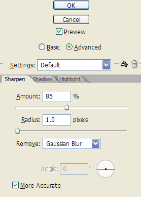 Photoshop CS2带来了称之为智能锐化滤镜的新的高级锐化滤镜。智能锐化可在“滤镜 > 锐化子菜单中找到。相较于标准的USM锐化滤镜,智能锐化的开发目的是用于改善边缘细节,阴影及高光锐化,智能锐化对话框的一部分如上动画截屏所示(图像预览被从截屏中剪裁掉了)。如你所见,在阴影和高光区域它对锐化提供了良好的控制,你可以从三个不同类型的模糊中选择移除——高斯模糊,运动模糊和镜头模糊。智能锐化设置可以保存为预设,供以后使用。