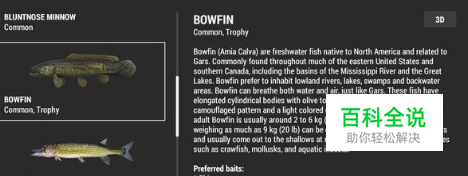 弓鳍鱼的牙齿粗壮而锐利,是贪婪的捕食者,肉食性,主要以水中生物和蛙类为食,长到10厘米左右开始捕食鱼类,也吃昆虫卵和浮游生物,成年个体还捕食蟹、虾等。一般的成年个体都在2到6公斤,最大被抓到的记录有9公斤之大。在游戏里的鱼饵可以用,Shiners 鳊鱼,Large Minnows 大号的小鱼, Small Cutbait 小鱼块,假饵可以用Crankbaits 曲柄饵,Shads 软虫,来捕获。
