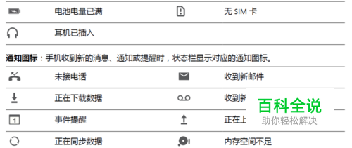 通知和状态图标含义 想知道手机当前的网络连接情况、电量是不是够用,手机静音了想随时知道是不是有新消息。您可以根据状态栏显示的图标,随时随地掌握手机的运行状况。 状态图标:查看状态图标,您可以快速了解设备当前的运行状态,比如网络连接、信号强度、电池电量、时间等信息。