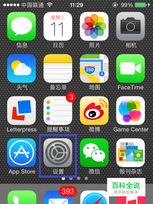 想要使用 Airplay 功能,小米电视和 iOS 设备都必须先接入同一个无线网络。 先打开 iPhone 主屏上的 “设置”图标,如图所示